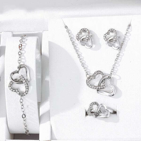 Λαμπερό σετ με πολυτελές δαχτυλίδι, κολιέ, βραχιόλι και σκουλαρίκια θα κάνει κάθε γυναίκα να νιώσει ξεχωριστή. Υλικά: Κράμα ψευδαργύρου + στρας